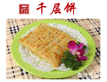 千层饼的前身是开封片饼,距今已有600多年的历史。经御世尚品大师潜心专研,在保持其传统精髓的前提下,大胆革新,一方面引进现代中点科学配方组合技术,使千层饼麦香更纯正,食用更健康,操作更标准,品质更稳定,使产品真正适合现代消费者对食品的选择。