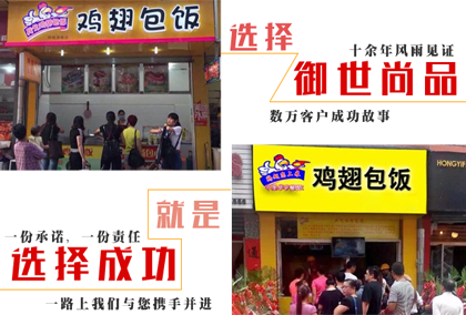 做御世尚品鸡翅包饭系列小吃总投资仅需几千元,就可轻松挣钱当老板,更有超乎你想象不到的高额利润。制做时百米外都能闻到诱人的香味,令食客闻香而来,所到之处家家好生意,只要你认真去做,就可以走上稳当的赚钱之路。